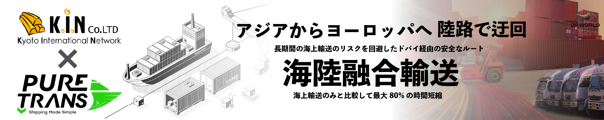 ケーアイエヌは、PURETRANS及びドバイ港と協業し、ドバイ港〜中東地域〜ヨーロッパまでの往復陸海融合輸送サービスを開始しました。これにより、日本を含むアジア〜ヨーロッパ間の新たな輸送が可能になります。昨今の海外輸送の高騰化、輸送期間の長期間化の問題の解決手段として、革命的な、包括的な輸送サービスを提供いたします。 | | 詳しい資料はケーアイエヌの公式ホームページ からダウンロードできます