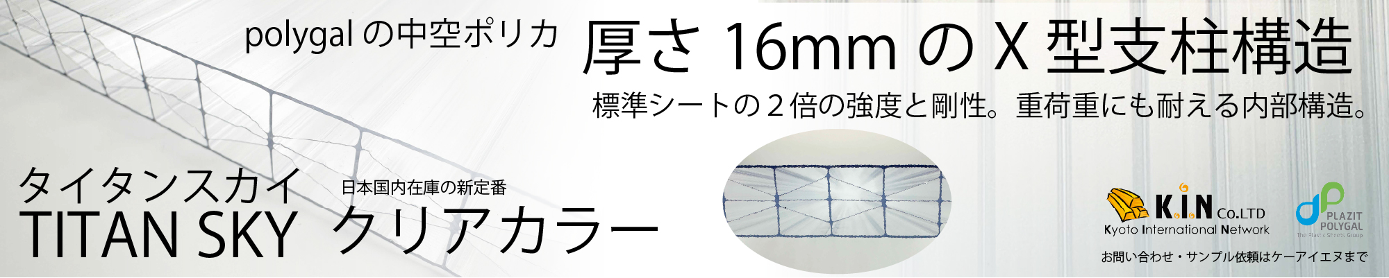 このたび、ケーアイエヌの日本国内、新定番商品として、「TITANSKY(タイタンスカイ) 」クリアカラー 16mm厚を取り扱いさせていただくこととなりました。 TITANSKY(タイタンスカイ)は、内部が重荷重に耐えられるようにX型支柱構造になっています。標準シートの2倍の強度と剛性を持っており、エクステリアでの使用はもちろん、その構造からの意匠性は、インテリアでの使用にも適しています。 スタンダードの中空ポリカーボネートとの違いを是非ご覧ください!サンプルもご用意しております。ぜひお問い合わせくださいませ。 | |